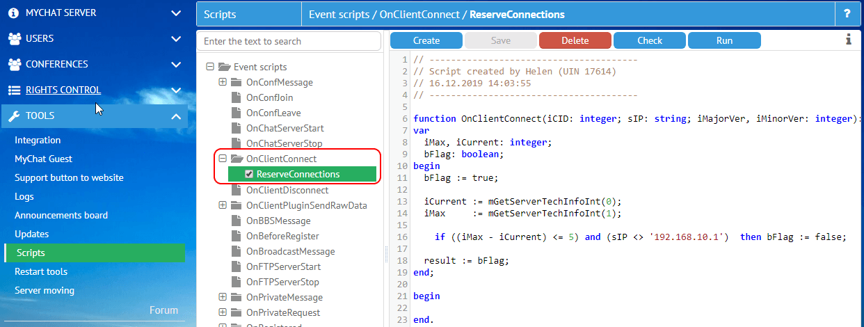The script is set on OnClientConnect event, and gives a guaranteed pool of free connections for a specified IP address that used for sending notifications from 1C: