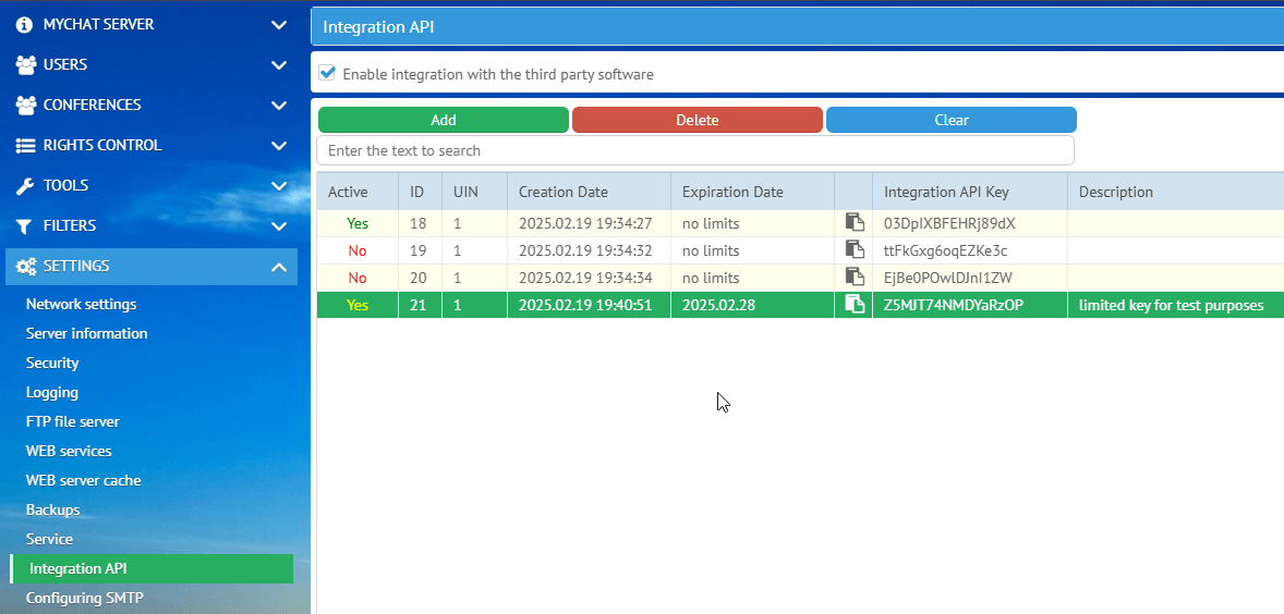Now, you can create any number of keys and enable and disable them in one click. You can delete a key, for example, if it is compromised. There is a button to clear out the whole key list. You can also specify the key expiration date and write a comment/description for each one of them(editing by double-clicking).