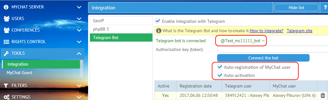 [+] (03.06.2018) (Admin) automatic registration and activation of Telegram users in MyChat.
