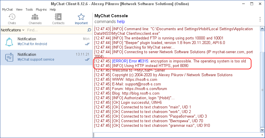 [*] (11.18.2021) if a local OS is too old (Windows XP/2000/2003), encryption will be disabled automatically . Also, MyChat Client works with the WEB server via HTTP on a separate port to download updates and exchange files. The number for this port is configured on MyChat Server;