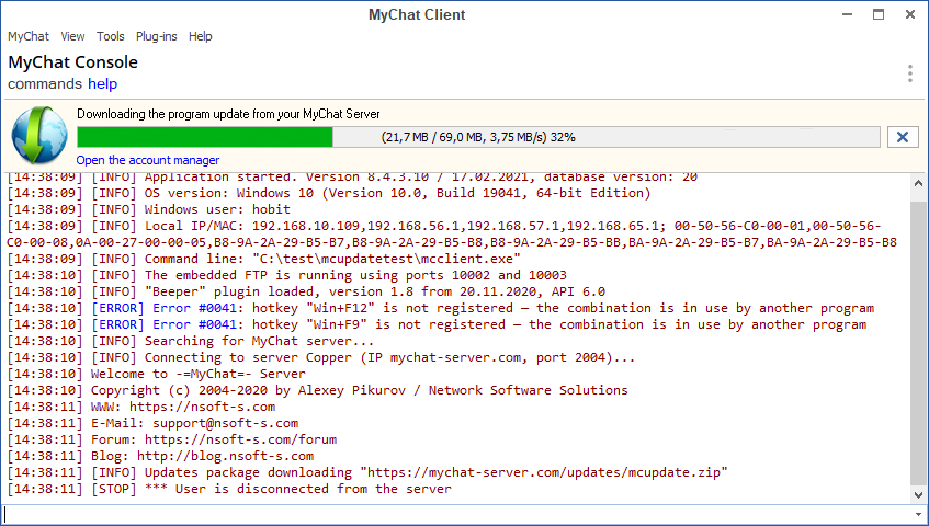 6. MyChat Client window does not display in the foreground (ruled by settings). The update process performed as conveniently as possible.