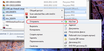 MyChat умеет интегрироваться в контекстное меню Проводника, поэтому вы сможете отправлять файлы и папки другим пользователям прямо из него. Или с помощью Ctrl+C, Ctrl+V. Или перетащить файлы мышкой на открытое окно MyChat. Минимум операций и максимальное удобство для человека.