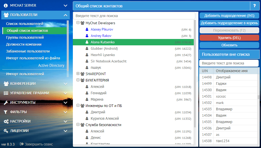 "Управление сервером", "Пользователи", "Общий список контактов".