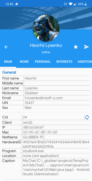 [*] (01.10.2020) (Android) completed redesign of the user's information page that displays all fields with corresponding sections (as in win32 client app). You can view the service information about the user's computer and check his active status if you have rights to do so;