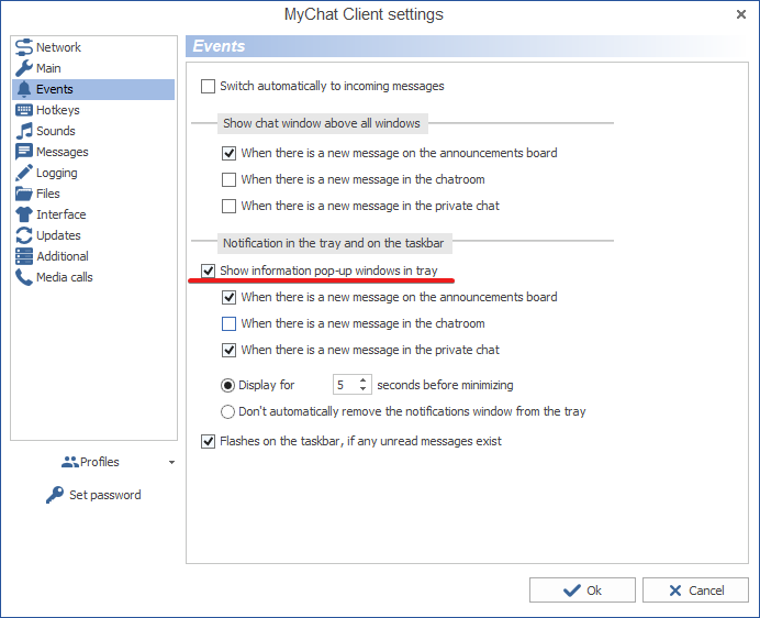Did you check the box for pop-up messages in MyChat Client settings? (See the screenshot below)