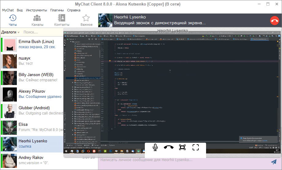 Все звонки и демонстрации экрана теперь записываются в историю сообщений, которая синхронизируется с сервера. Также теперь возможны звонки с демонстрацией экрана, даже если в системе нет физического микрофона.