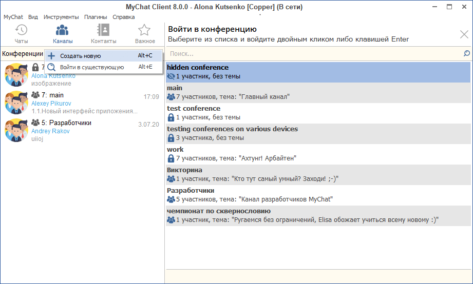 Чтобы создать новую конференцию или войти в существующую, нужно нажать на кнопку-селектор в разделе "Каналы" (или комбинацию "горячих" клавиш"):