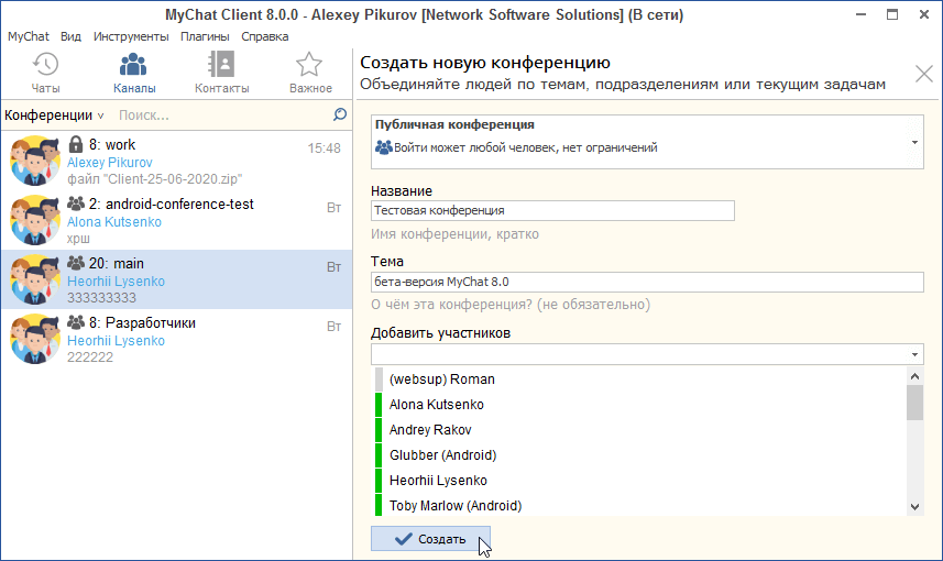 После создания новой конференции вы автоматически становитесь модератором. Можно пригласить туда нужных вам людей и выбрать тип конференции (обычная, закрытая паролем или невидимая):