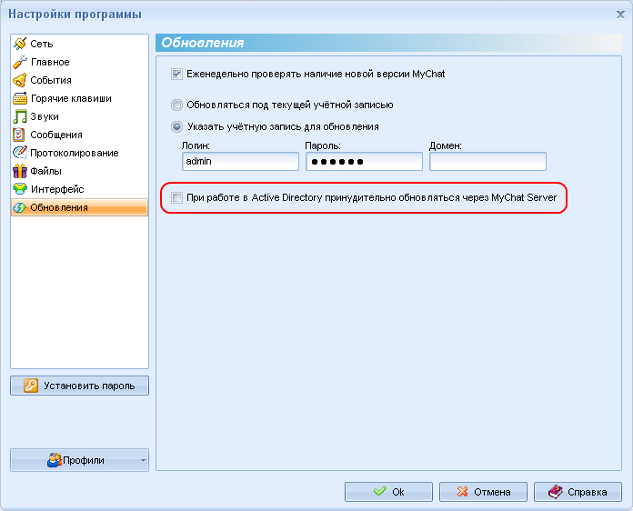Если MyChat Client работает в Active Directory, а обновление через групповые политики, используя MSI пакет, реализовать невозможно по каким-либо причинам, то для такого случая была добавлена опция в настройках для принудительного обновления с MyChat Server, даже если клиент работает с Active Directory авторизацией. "Настройки" — "Обновления" — "При работе в Active Directory принудительно обновляться через MyChat Server":
